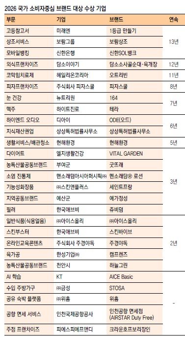 2026년 올해에는 총 27개 브랜드가 선정됐다. 미래엔 ‘1등급 만들기’와 보람그룹 ‘보람상조’, 신한은행 ‘신한SOL뱅크’는 13년 연속 수상하며 명실공히 최고 브랜드라는 수식어를 이어 나갔다. 담소이야기의 ‘담소소사골순대·육개장’은 12년 연속 수상이며 헤일리온코리아의 ‘오트리빈’은 11년 연속으로 명예의 전당을 지키고 있다.