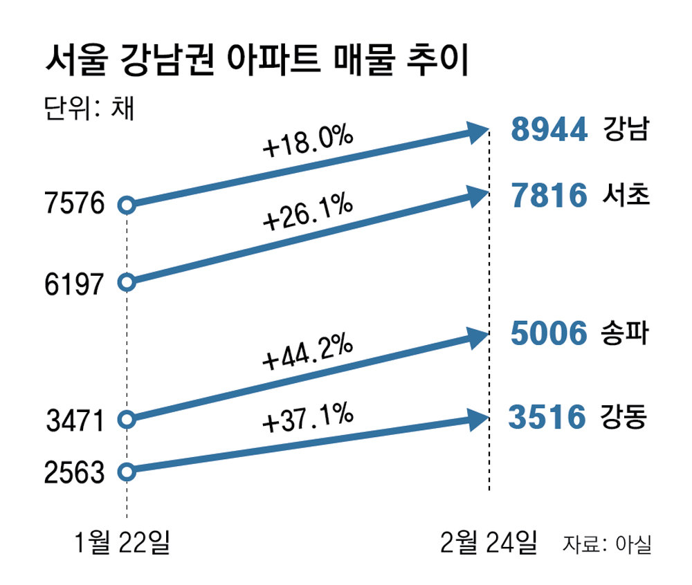 이날 부동산 플랫폼 아파트실거래가(아실)에 따르면 서울 아파트 매물은 지난달 22일 5만6216건에서 이날 기준 6만8564건으로 21.9% 늘었다. 25개 구에서 매물이 모두 늘어났는데, 그중에서도 성동구(55.1%), 송파구(44.2%), 동작구(40.2%), 강동구(37.1%), 광진구(35.7%), 마포구(35.3%) 등의 순이었다. 지난해 집값 상승이 컸던 한강벨트와 강남권인 송파구 등의 매물이 늘어난 셈이다.