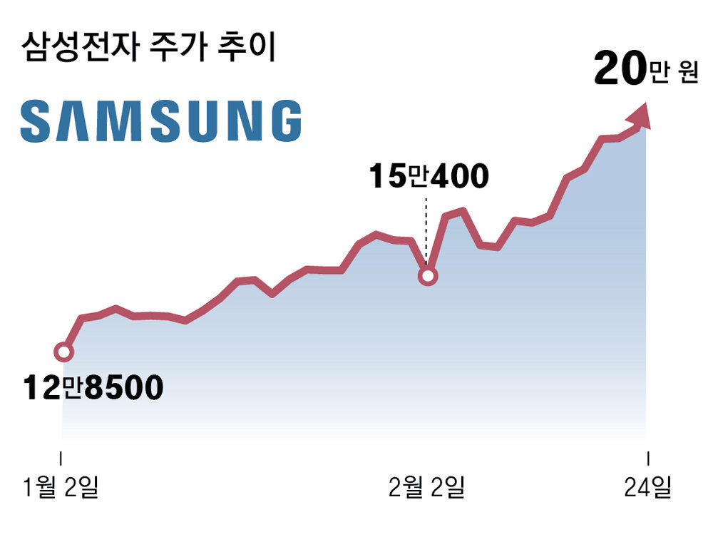 24일 삼성전자는 전 거래일 대비 3.63% 오른 20만 원으로 마감했고, SK하이닉스는 5.68% 상승한 100만5000원으로 마감했다. 나란히 20만 원과 100만 원이라는 벽을 넘어섰다. ‘황제주’에 등극한 SK하이닉스는 이날 미국 마이크론을 제치고 글로벌 시가총액 순위 21위에 올랐다. 코스피는 이날 5,969.64로 마감하며 지난달 27일 종가 기준 5,000을 돌파한 지 한 달도 채 되지 않아 6,000 돌파를 목전에 두고 있다.
