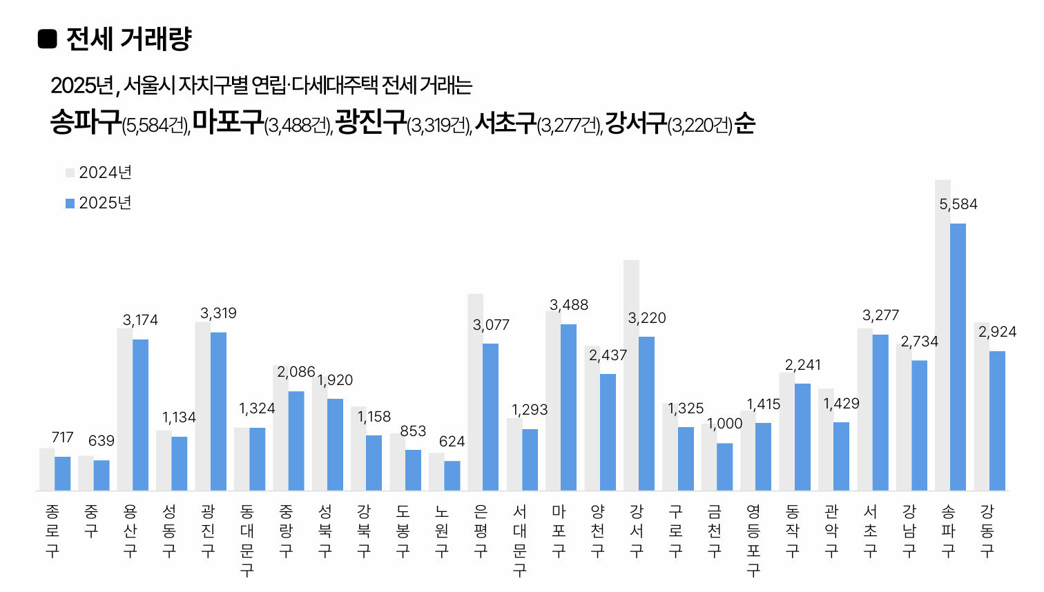 상업용 부동산 종합 서비스 기업 부동산플래닛이 24일 발표한 ‘2025년 연간 서울시 연립·다세대주택 매매 및 전·월세시장 동향’에 따르면, 지난해 서울 연립·다세대주택 임대차 거래량은 13만834건으로 직전 연도 대비 6.4% 감소했다.