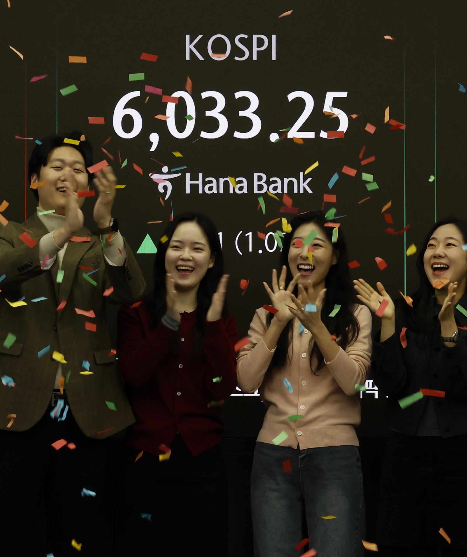 코스피가 장중 6,000을 넘은 25일 오전 서울 중구 하나은행 딜링룸에서 관계자들이 코스피 6000 돌파를 축하하고 있다. 2026.02.25. 서울=뉴시스