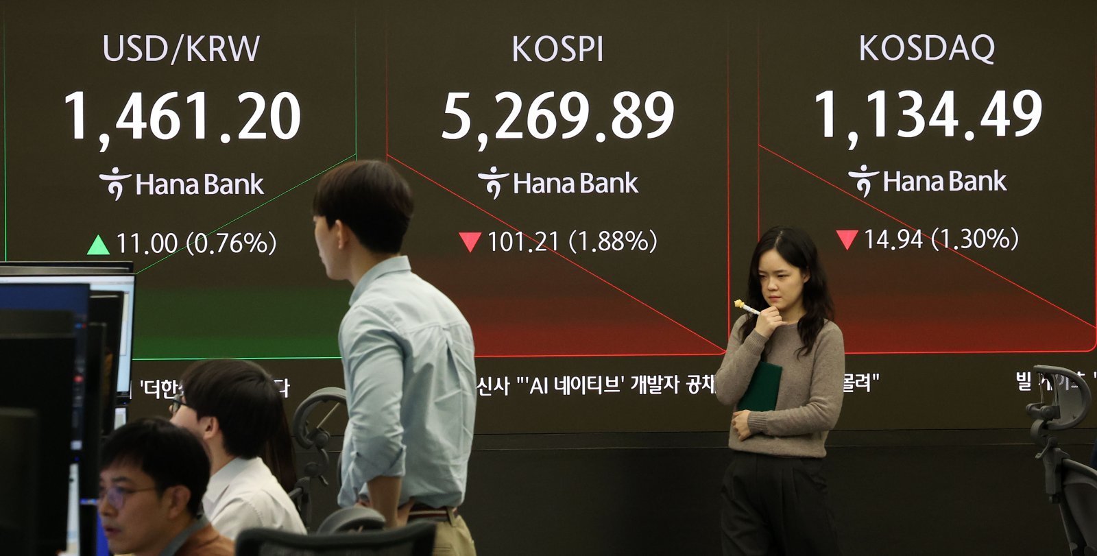 코스피가 전 거래일(5371.10)보다 120.07포인트(2.24%) 하락한 5251.03, 코스닥 지수는 전 거래일(1149.43)보다 12.35포인트(1.07%) 내린 1137.08에 거래를 시작했다. 서울 외환시장에서 원·달러 환율은 전 거래일 주간거래 종가(1450.2)보다 10.8원 오른 1461.0원에 출발한 5일 서울 중구 하나은행 본점 딜링룸 전광판에서 시황이 표시되고 있다. 2026.02.05 뉴시스