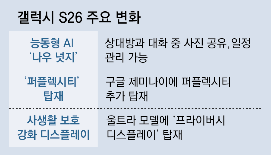 이번 갤럭시 S26 시리즈는 사용자가 필요한 기능을 알아서 척척 수행하는 ‘눈치 빠른 AI’로 진화했다. 나우 넛지를 통해 사진 공유뿐 아니라 맥락에 맞춰 다양한 기능을 수행할 수 있다. 예를 들어 협력사 직원과 미팅 일정을 조율할 때, 상대방이 “26일 오전 10시 괜찮냐”고 물으면 AI가 캘린더를 확인해 중복 일정이 있는지 알려주는 것이다.