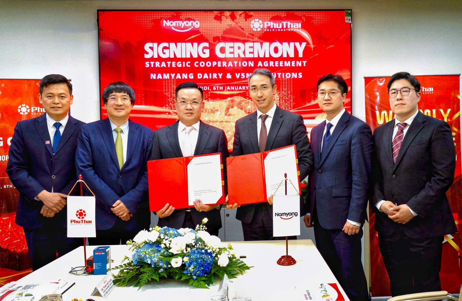 남양유업은 지난 1월 베트남 최대 유통 기업 푸타이 그룹과 전략적 파트너십 계약을 체결했다. 왼쪽부터 응우옌 비엣 끄엉 푸타이 그룹 부사장, 팜 딘 도안 회장, 찐 비엣 흥 비즈니스 디벨롭먼트 디렉터, 김승언 남양유업 대표집행임원 사장, 서성현 글로벌사업팀장, 김응식 글로벌사업팀 차장. 남양유업 제공
