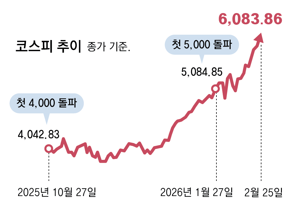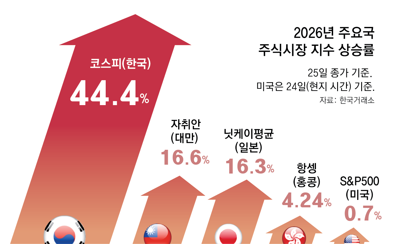 25일 한국거래소에 따르면 코스피는 5,000 돌파 한 달 만에 6,000을 넘겼다. 코스피가 주요 마디를 통과하는 속도는 점점 빨라지고 있다. 2,000에서 3,000 돌파에 13년 5개월, 3,000에서 4,000 돌파에 4년 9개월, 4,000에서 5,000 돌파에 3개월이 소요됐다. 가속이 붙으며 올해 들어 이달 25일까지 44.4% 오른 코스피는 주요국 증시 중 상승률 1위다. 대만 자취안 지수(+16.6%), 일본 닛케이225 평균주가(+16.3%) 등을 크게 앞지른 수치다.