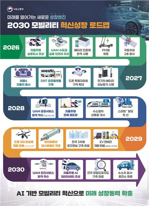 국토교통부는 ‘2030 모빌리티 혁신성장 로드맵’을 수립해, AI 기술을 활용한 향후 5년 모빌리티 정책 방향성을 제시했다고 26일 밝혔다.