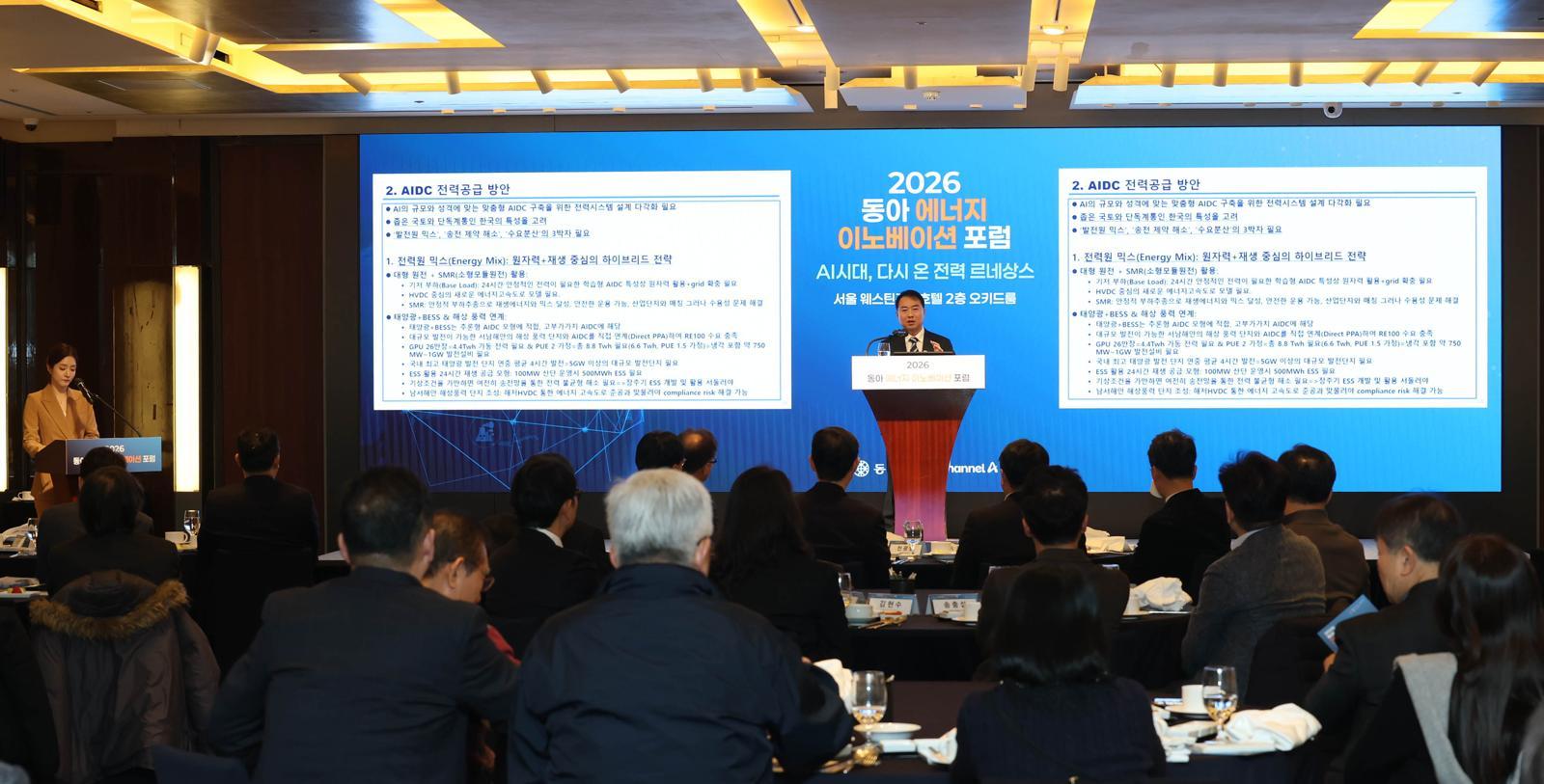 26일 오전 서울 웨스틴조선호텔 오키드룸에서 2026 동아 에너지 이노베이션 포럼이 열리는 가운데 이찬주 HD 현대일렉트릭 연구소장이 사례발표를 하고 있다. 변영욱 기자 cut@donga.com 사례발표에 나선 이찬주 HD현대일렉트릭 연구소장(전무)는 유연한 전력망의 중요성을 강조했다. 이 소장에 따르면 AI가 추론을 할때마다 전력 계통의 부하는 초단위로 급상승했다가 다시 급락하기를 반복한다. AI 시대 중요한 전력원이 될 재생에너지 또한 발전량, 발전 시간이 일관적이지 않다는 단점이 있다. 이는 갑작스런 정전을 유발할 수 있는 요소들이다. 이에 이 전무는 AI가 실시간으로 전력 계통을 분석해 어디에 전력 수요가 몰리는지 파악하고 이를 효율적으로 분배하는 방안을 소개했다. 그는 “AI로 인한 전력 수급 위기를 AI로 해결할 수 있을 것”이라고 말했다.