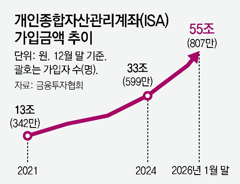 26일 금융투자협회에 따르면 1월 말 기준 ISA 가입자 수는 807만 명, 가입액은 54조7000억 원이었다. 가입액은 1월에만 6조4000억 원이 늘면서 월 단위로 역대 최대 증가 폭을 보였다.