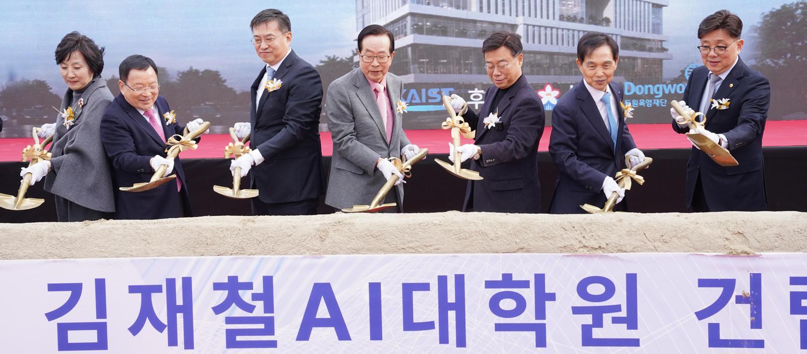 26일 경기 성남시에서 열린 ‘KAIST 김재철AI대학원’ 건립사업 기공식에서 김재철 동원그룹 명예회장(왼쪽에서 네 번째), 김남정 동원그룹 회장(왼쪽에서 세 번째) 등 주요 참석자들이 첫 삽을 뜨고 있다. 동원그룹 제공