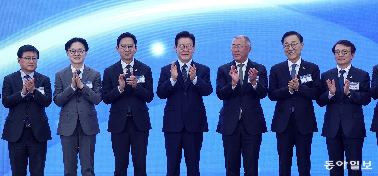 이재명 대통령과 정의선 현대자동차 회장이 27일 전북 군산시 새만금 컨벤션센터에서 열린 새만금 로봇·수소·AI 시티 투자협약식에서 투자협약을 체결한 뒤 기념촬영을 하고 있다. 왼쪽부터 김성환 기후에너지환경부 장관, 김정관 산업통상부 장관, 배경훈 부총리 겸 과학기술정보통신부 장관, 이재명 대통령, 정의선 현대자동차 회장, 김윤덕 국토교통부 장관, 김의겸 새만금청장. 송은석 기자 silverstone@donga.com