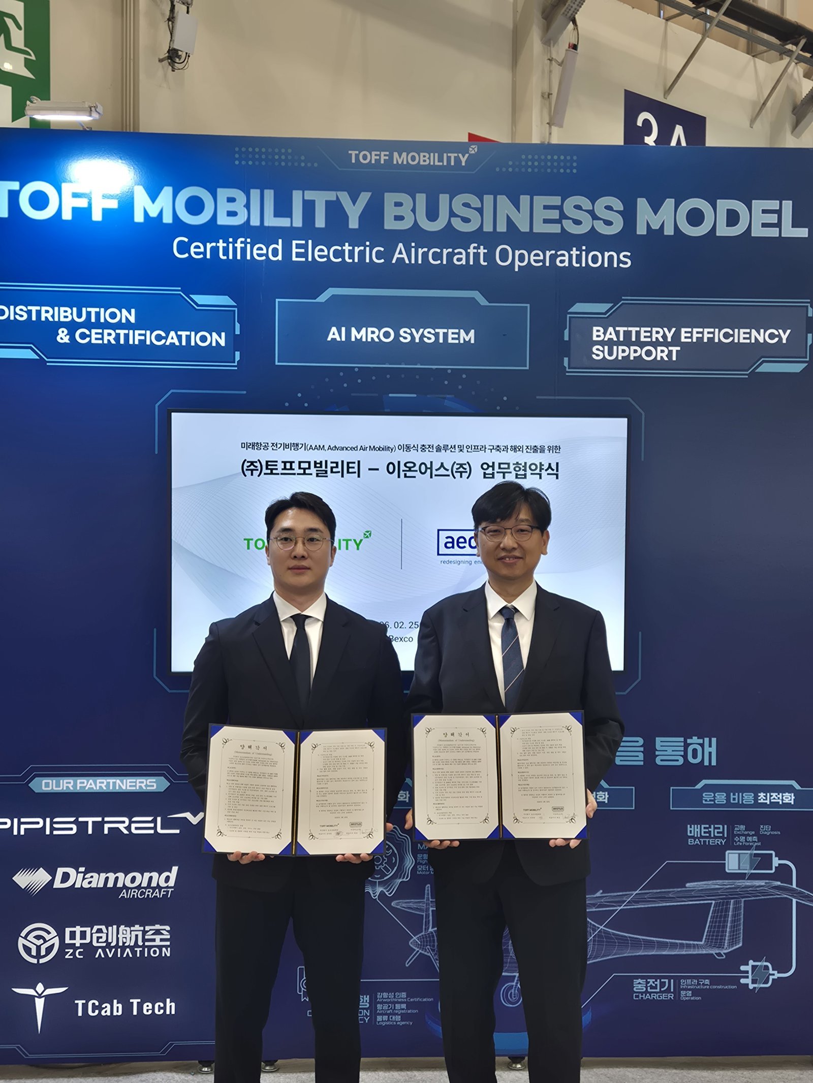 이동형 에너지저장장치(ESS) 기반 전력 솔루션 기업 이온어스가 전기비행기 전문기업 토프모빌리티와 미래항공 모빌리티(AAM) 전동화 인프라 구축을 위한 전략적 업무협약(MOU)을 체결했다고 27일 밝혔다.