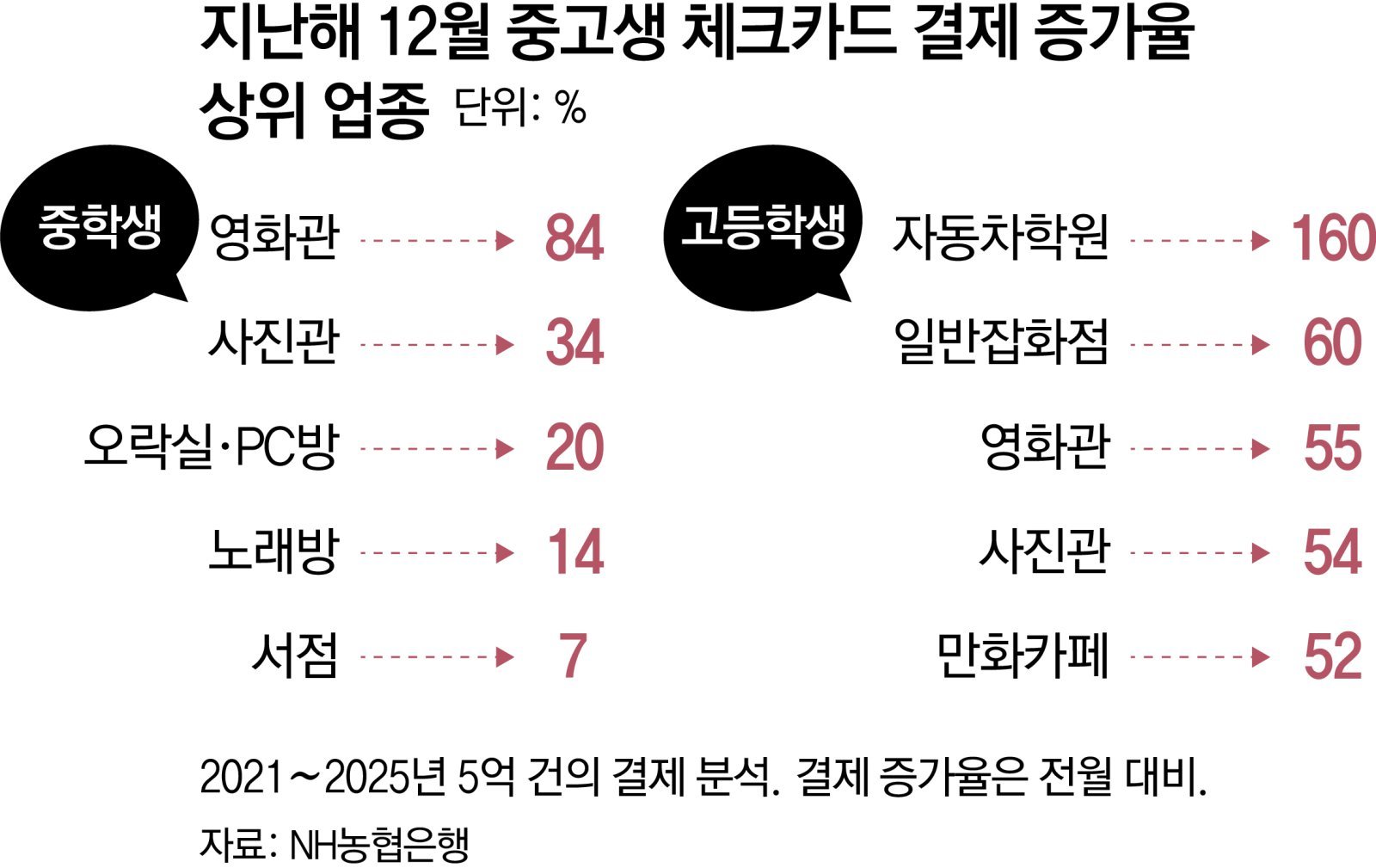 새 학기가 시작되는 3월에는 서점 결제 건수가 2배가량 는다. 12월 겨울방학 기간에는 영화관 결제 건수가 증가한다. 고등학생의 경우 수능을 마친 뒤 운전면허를 따는 경우가 많아 자동차학원이 소비 증가 업종 1위를 차지했다.