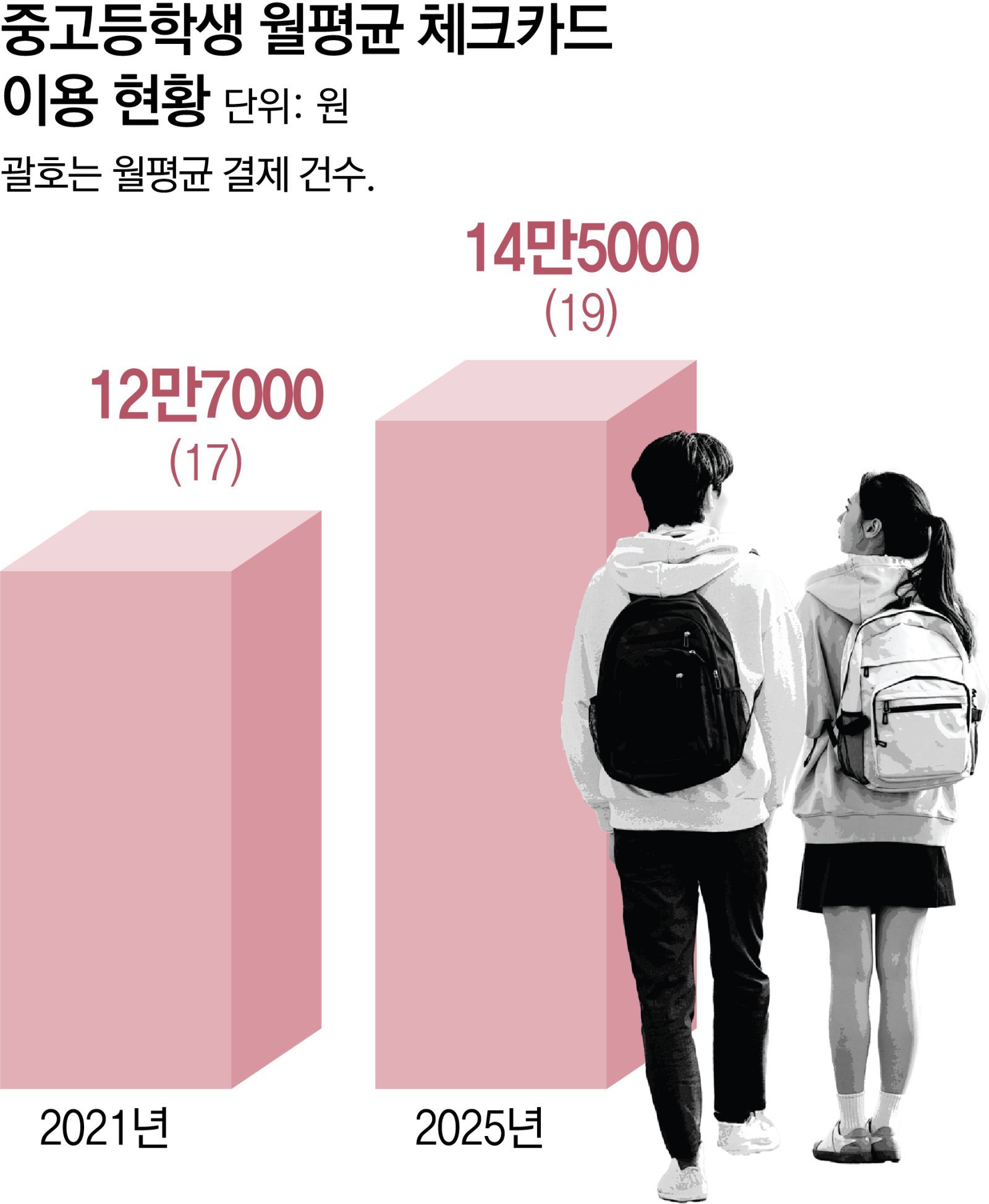 학생들은 실제 카드를 어떻게 사용하고 있을까. 취재팀은 NH농협은행이 2021∼2025년 중고등학생 체크카드 결제 데이터 약 5억 건(연평균 1억 건)을 분석한 자료를 토대로 학생들의 소비 특성을 확인해봤다. NH농협은행은 금융·카드·유통데이터를 모두 보유하고 있어 분석이 가능하다. 지난해 한국 중고등학생들 연간 평균 결제 금액은 174만4000원이었다. 용돈은 매달 14만5000원꼴이었다. 4년 전인 2021년(12만7000원)에 비해 조금 늘었다.