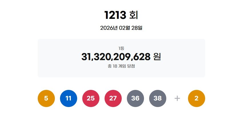 28일 제1213회 동행복권 로또 추첨 결과 ‘5, 11, 25, 27, 36, 38’이 1등 당첨 번호로 결정됐다. 2등 보너스 번호는 ‘2’이다.