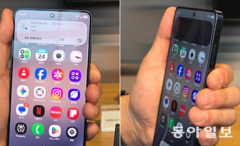 삼성전자 갤럭시 S26 울트라(왼쪽 사진)를 옆으로 돌려보니 화면 위쪽 메시지창이 까맣게 표시돼 문자 내용을 볼 수 없었다. 삼성전자가 새롭게 선보인 프라이버시 디스플레이는 화면 전체를 가려줬던 기존 보호필름과 달리 사용자가 지정한 기능이나 영역만 보이지 않도록 설정할 수 있다. 픽셀 단위로 발광을 제어하는 기술 덕분이다. 샌프란시스코=박현익 기자 beepark@donga.com