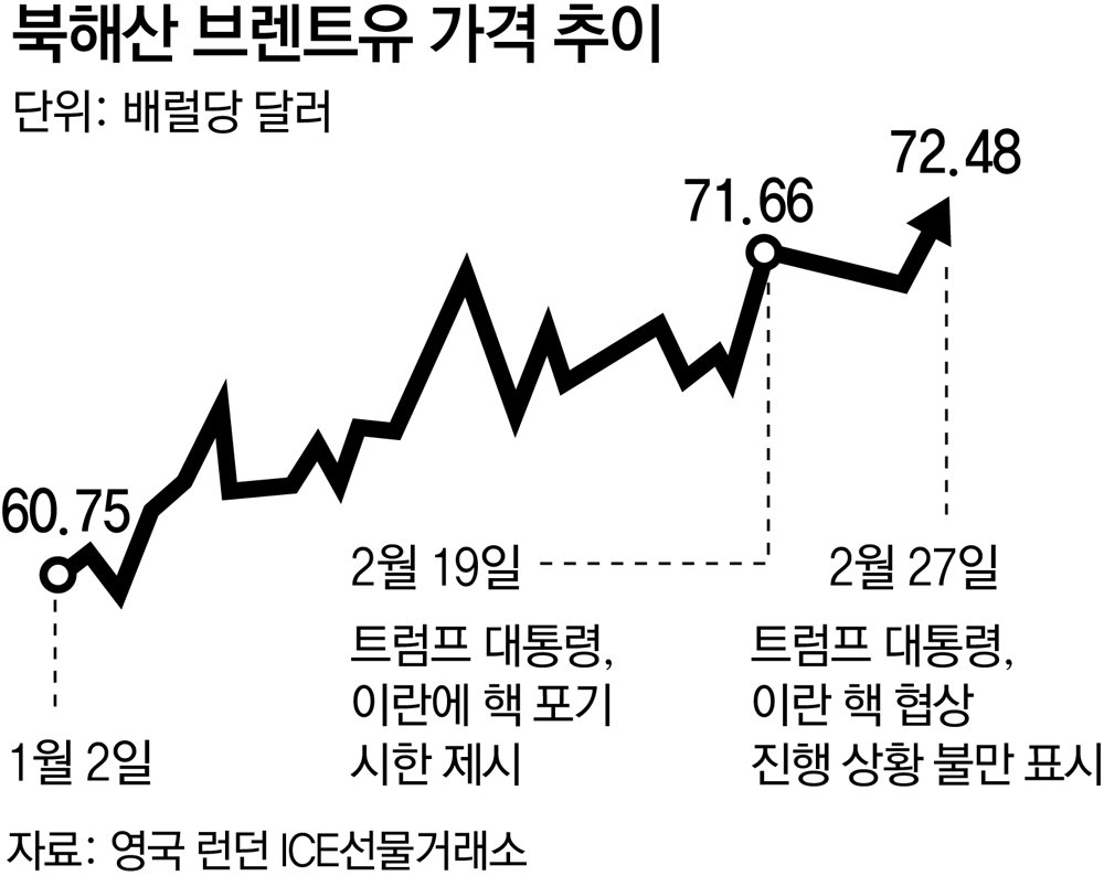 호르무즈 해협이 끊기면서 국제유가가 배럴당 100∼150달러까지 오를 수 있다는 전망이 나온다. 지난달 27일 북해산 브렌트유는 배럴당 72.48달러에 마감했는데, 두 배 이상으로 오를 수 있다는 것이다. 영국 투자은행(IB) 바클레이스 에너지분석팀은 “중동 안보 상황 악화로 인한 잠재적 공급 차질 위협으로 브렌트유 가격이 배럴당 100달러까지 치솟을 수 있다”고 관측했다. 스웨덴계 금융사 SEB는 호르무즈 해협 봉쇄가 길어질 경우 배럴당 150달러까지 오를 수 있다고 내다봤다.