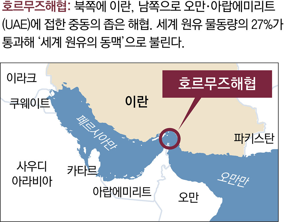 호르무즈 해협은 북쪽에 이란, 남쪽으로 오만·아랍에미리트(UAE)에 접한 중동의 좁은 해협이다. 세계 원유 물동량의 27%가량이 이곳을 통과한다. 호르무즈 해협의 전체 폭은 55km지만 유조선이 지날 수 있는 구간은 10km 이내에 불과하다. 이 구간은 전부 이란 영해다.