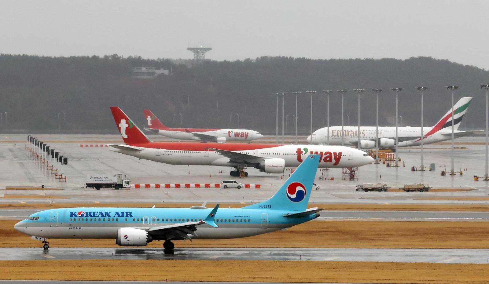 미국의 이란 공습으로 중동 지역의 군사적 긴장이 고조되면서 두바이행 등 일부 항공편이 운항 중단된 2일 인천국제공항 주기장에 항공기가 세워져 있다. 2026.03.02. [인천공항=뉴시스]
