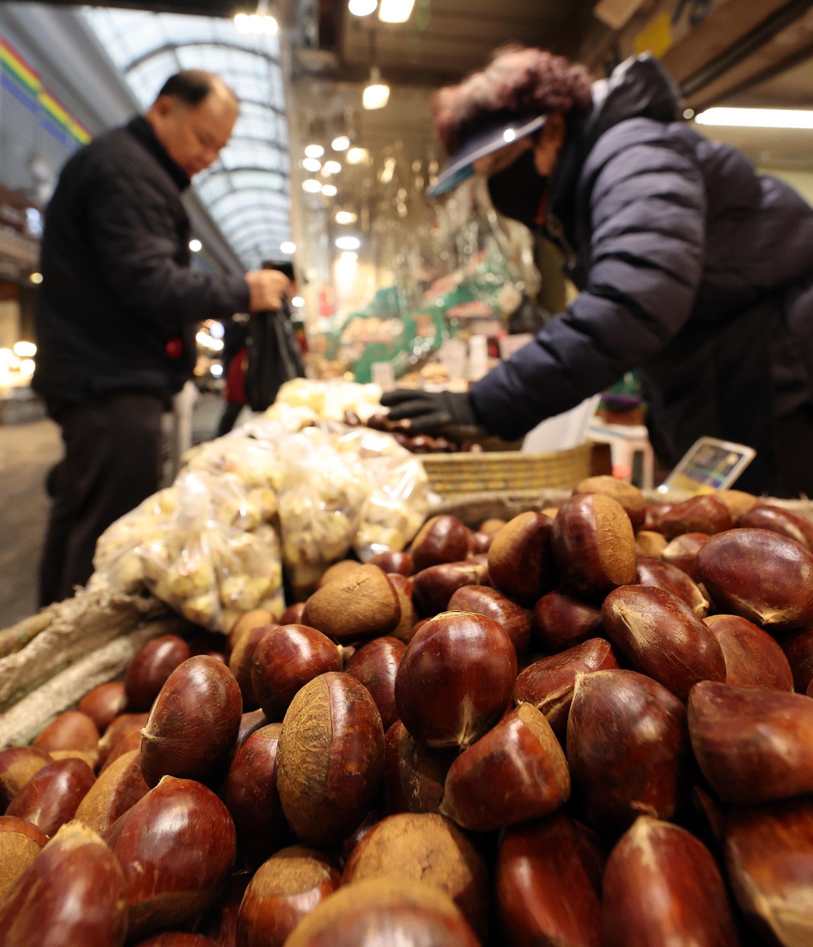 정월대보름(음력 1월 15일)을 하루 앞둔 2일 서울 동대문구 경동시장에서 한 상인이 밤과 호두, 땅콩 등 부럼을 판매하고 있다.