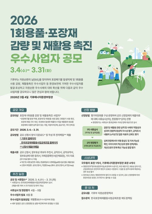 기후부는 “이번 공모를 통해 1회용품·포장재 감량 및 재활용에 대한 사회적 인식을 높이고, 관련 사업을 적극적으로 추진하는 계기가 되기를 기대한다”고 전했다.