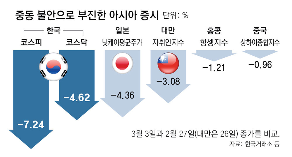 3일 국내 금융시장이 패닉에 빠지며 코스피가 역대 최대 낙폭(452.22)을 나타낸 건 미국과 이란의 전쟁이 본격화하면서 ‘중동 리스크’가 장기화될 것이라는 공포가 시장을 덮쳤기 때문이다.