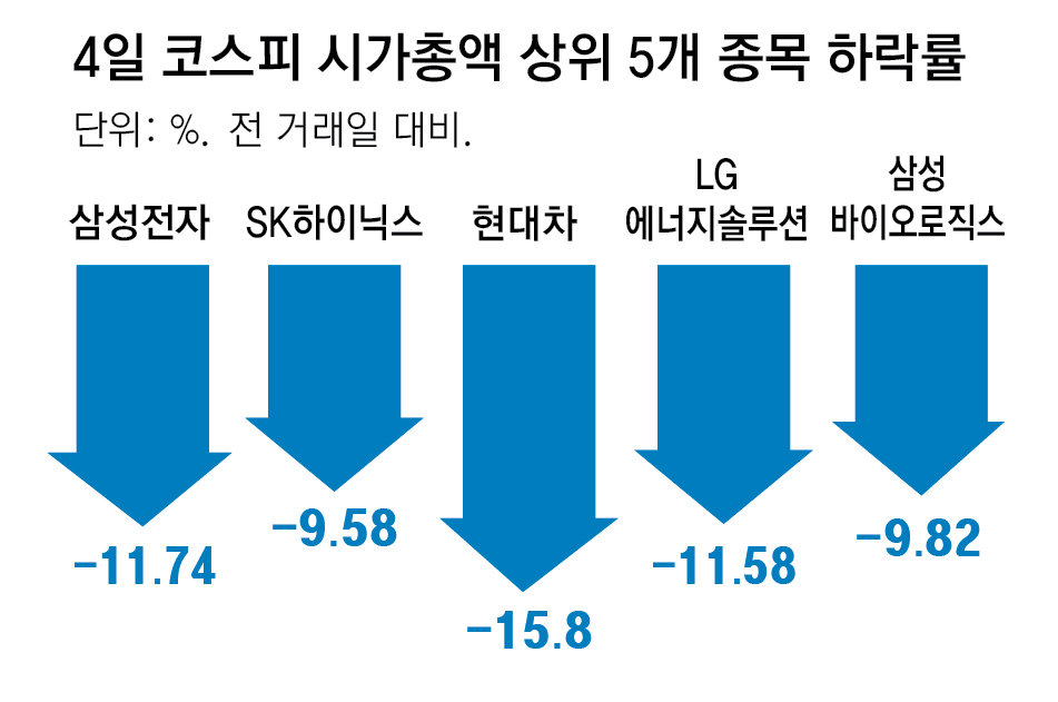 그간 국내 증시를 이끌던 반도체, 자동차, 조선 관련 종목이 큰 폭으로 하락하며 지수를 끌어내렸다. 삼성전자와 SK하이닉스는 각각 11.74%, 9.58% 하락했다. 현대차(―15.80%), 기아(―14.04%)는 물론이고 전날 올랐던 방산주 한화에어로스페이스(―7.61%)도 동반 급락했다. 이날 코스피 상승 종목은 17개(상한가 4개 포함)였지만 하락 종목은 912개(하한가 1개)에 달했다.