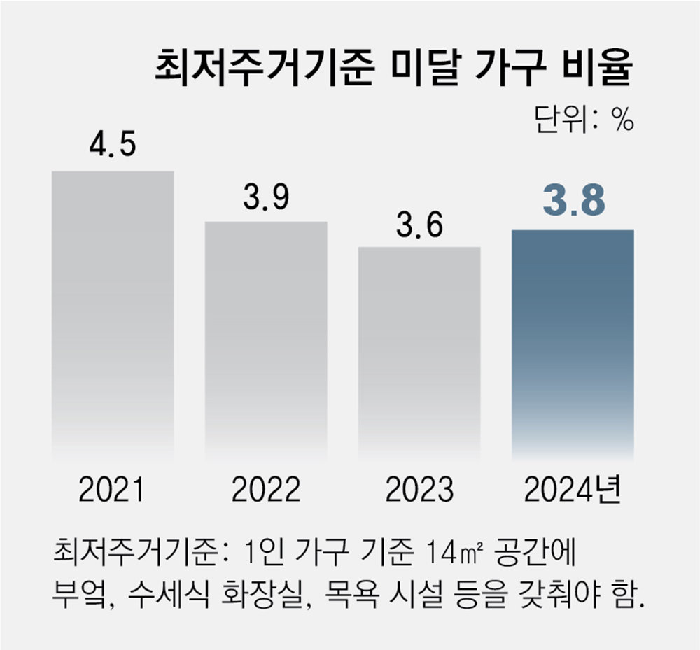 5일 국가데이터처가 발표한 ‘국민 삶의 질 2025’ 보고서에 따르면 2024년 최저주거기준 미달 가구 비율은 3.8%로 1년 전보다 0.2%포인트 증가했다. 최저주거기준 미달 가구 비율이 증가한 것은 2017년(5.9%) 이후 7년 만이다.