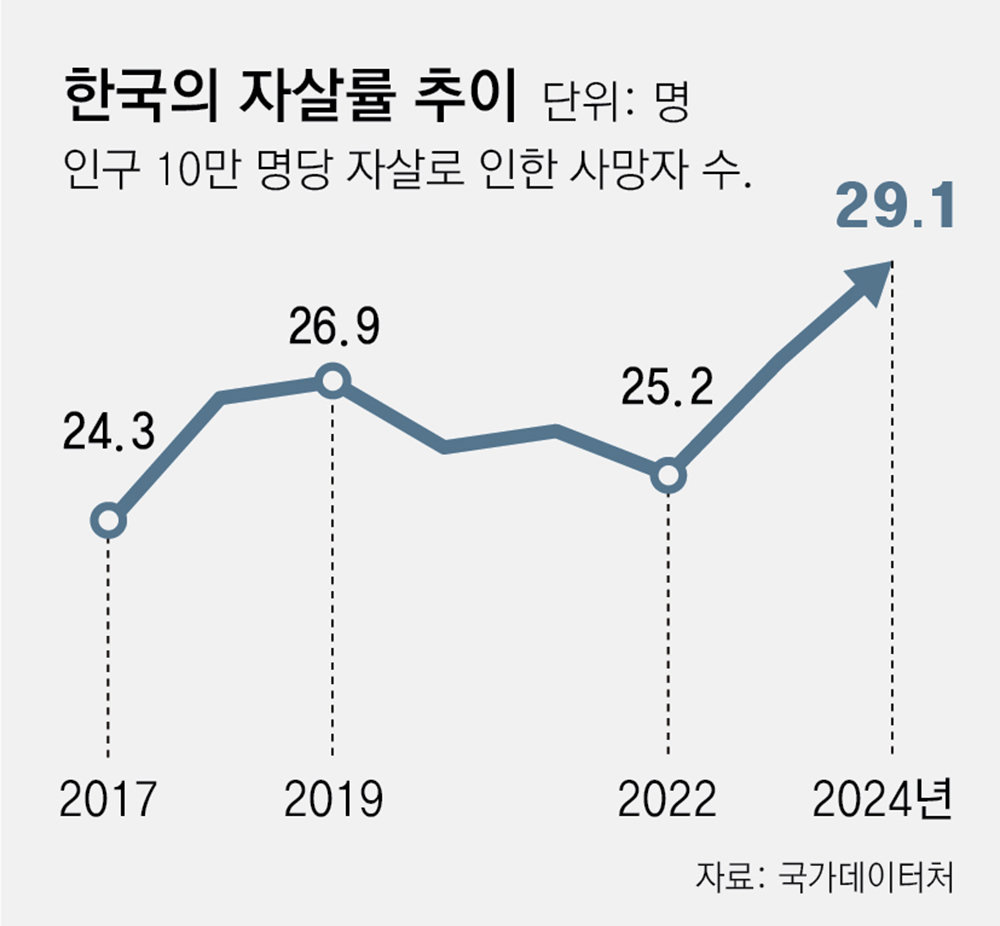 자살률은 13년 만에 가장 높았다. 2024년 인구 10만 명당 자살로 인한 사망자 수는 29.1명이었다. 전년 대비 1.8명 늘면서 2011년(31.7명) 이후 가장 높았다. OECD에서 작성하는 국제 비교 자료 기준 한국의 자살률은 2022년 22.6명으로 2위인 슬로베니아(17.5명)보다 크게 높다.