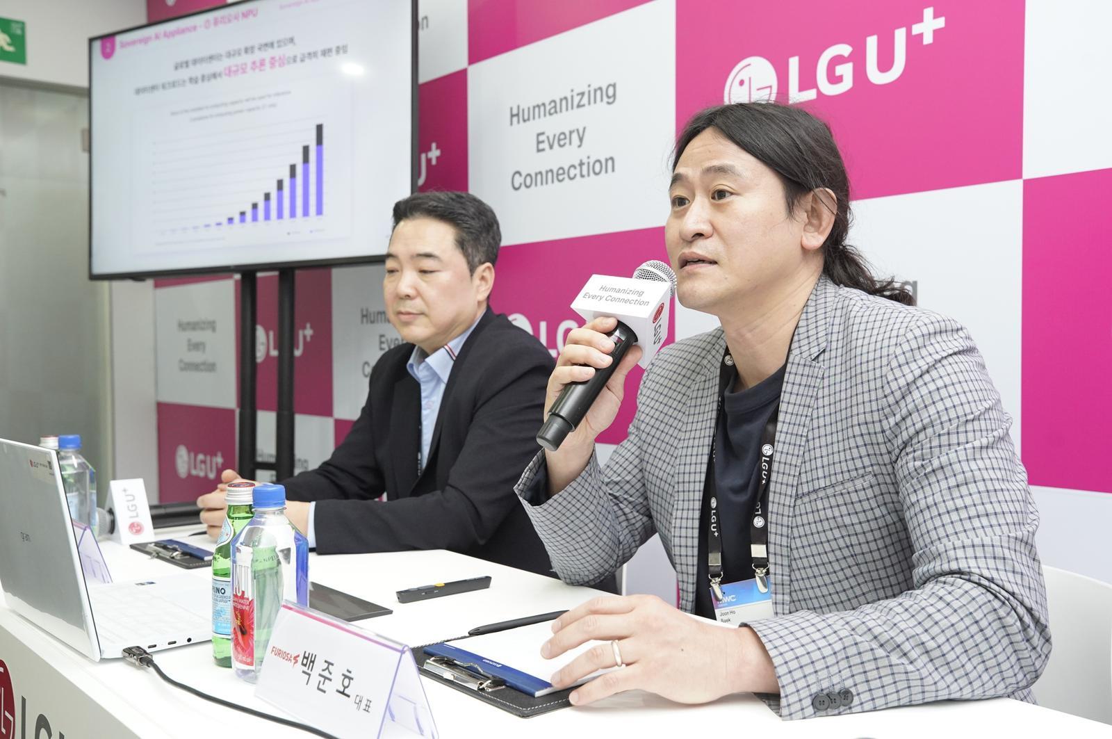 이상엽 LG유플러스 CTO(전무·오른쪽)와 백준호 퓨리오사AI 대표가 4일(현지시간) 스페인 바르셀로나 ‘MWC26’ 전시장에서 기업용 ‘소버린(Sovereign) AI 어플라이언스’ 개발을 위한 MOU를 체결한 후 기자들의 질의에 답하고 있다. LG유플러스 제공.