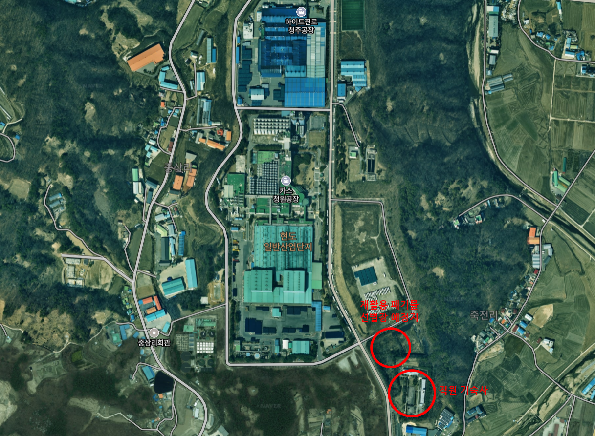 위성사진으로 본 충청북도 청주시 현도일반산업단지와 재활용 폐기물 선별장 예정지 및 근로자 기숙사 위치. 재활용 폐기물 선별장 건립이 추진되면서 예정지와 불과 500m 떨어진 곳에 공장이 위치한 오비맥주와 하이트진로 등 입주 기업들은 강하게 반발했다. 이들은 “30년 넘게 지켜온 식품 제조 공정의 특수성을 전혀 고려하지 않은 일방적 행정”이라고 목소리를 높이고 있다. 재활용 폐기물 선별장이 들어서면 공기 중 부유 물질이나 해충, 악취 유입으로 인한 품질 저하를 피하기 어렵다는 것이다.