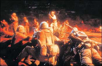 이처럼 직선적이고 투박한 제목의 ‘위 워 솔저스’(We Were Soldiers)는 거두절미하고 생사가 엇갈리는 전투 한 가운데를 파고 든다. 그 전장은 미국과 월맹군간의 사실상 첫 접전인 1965년 베트남 북부 이아 드랑(죽음의 계곡) 전투. 이를 다큐멘터리식 카메라 워크로 섬세하게 잡아낸 이 영화는 리얼한 전투 장면이 주는 영화적 흥미를 전면에 내세우면서 반전 의식도 양념처럼 담는 할리우드 전쟁 영화의 흐름을 따르고 있다.