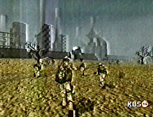 23일 KBS1 ‘뉴스9’의 버추얼 스튜디오는 공격용 헬기와 탱크가 포격을 가하며 사막을 가로지르는 모습이 효과음과 함께 그래픽으로 전달됐다. 전폭기가 투하한 폭탄이 바그다드 시내에 비오듯 떨어지며 시가지가 초토화되는 장면도 그래픽으로 묘사됐다.