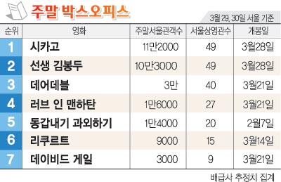 외화와 한국영화의 자존심 대결로 관심을 모았던 ‘시카고’와 ‘선생 김봉두’의 서울극장가 맞대결은 ‘시카고’의 승리로 판가름났다. 지난달 28일 개봉한 두 영화는 29, 30일 서울 극장가에서 각각 11만 2000명, 10만 3000명의 관객을 동원해 1, 2위에 올랐다. 그러나 제작사들이 자체 집계한 전국 관객누계로 봤을 때는 ‘선생 김봉두’가 ‘시카고’를 앞섰다. 전국 190개 스크린을 확보한 ‘선생 김봉두’는 29, 30일 37만여명의 관객을 기록했다. 반면 전국 160개 스크린에서 상영 중인 ‘시카고’는 같은 기간 28만 4000명을 동원했다. 지방관객이 서울관객보다 한국적 정서에 호소하는 영화를 더 선호하기 때문이라는 분석.