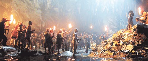 이 영화를 기존 해적 영화와 구별짓는 것은 ‘저주’다. 이를 통해 보물을 찾아다니는 해적의 얘기가 빼앗은 보물을 돌려줘야 하는 해적의 얘기로 바뀐다. ‘블랙 펄’호의 저주받은 보물로 인해 영원히 죽을 수 없는 바르보사 일당은 달빛을 받으면 살아있는 해골로 변한다. 심해에서 달빛을 받으면 해골로 변하는 특수 효과가 볼 만하다. 감독은 ‘멕시칸’ ‘마우스헌트’ 등의 고어 버빈스키. 9월5일 개봉.
