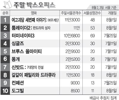 ‘툼레이더2:판도라의 상자’가 11만명으로 2위를 차지했고 지난주 1위였던 ‘터미네이터3’은 서울 관객 10만6800명을 동원해 3위로 밀려났다.