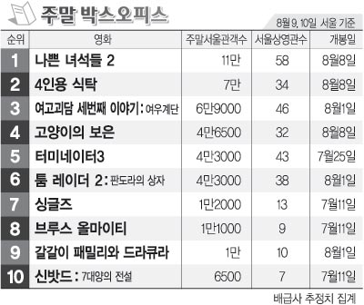 ‘4인용 식탁’과 ‘여고괴담 세 번째 이야기:여우계단’ 등 두 편의 한국 공포영화 대결에서는 ‘4인용 식탁’이 근소한 차이로 앞섰다. 지난주 1위를 차지했던 ‘여고괴담 세 번째 이야기:여우계단’은 3위로 내려앉았지만 상영 2주 만에 전국 관객 100만명을 넘어섰다.