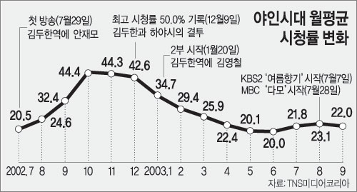 평균 37%의 높은 수치를 보이던 ‘야인시대’ 1부의 시청률은 정치드라마 색채가 짙어지고 선악구도가 모호한 ‘장년 김두한’(2부)으로 접어들면서 서서히 하락, 20% 대로 떨어졌다. 여기에 같은 시간대 MBC ‘옥탑방 고양이’(6월 2일∼7월 22일) ‘다모’(7월 28일∼9월 9일)와 KBS2 ‘여름향기’(7월 7일∼9월 8일) ‘상두야 학교가자’(9월 15일∼) 등 젊은층을 노린 감성적 화제작들이 속속 도전장을 내밀었지만, ‘야인시대’는 중장년층의 변함없는 지지를 받으며 2부 평균 23.6%의 시청률을 이어갔다. 유태웅(유지광) 김영호(이정재) 최준용(임화수)의 선 굵고 개성적인 연기는 시청자들에게 깊은 인상을 남겼다.