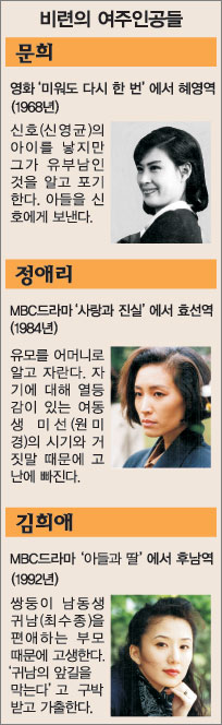 영화 ‘미워도 다시 한번’(68년)의 문희→드라마 ‘사랑과 진실’(MBC·84년)의 정애리→‘아들과 딸’(MBC·92년)의 김희애 등이 굵직한 ‘불운의 여주인공’들로 꼽힌다. ‘불운전문 여배우’들의 배역은 남자로부터 버림받거나 농락당하지만 운명에 순응하면서 살아가는 등 ‘남성 권력에 의해 희생되는 피학적 여성상’을 담고 있다.