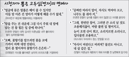 하지만 KBS2 수목 드라마 ‘꽃보다 아름다워’(밤 9·50)는 꽃 같은 젊은 연기자들이 나오는 경쟁 채널의 드라마와 맞붙어 20% 가까운 높은 시청률을 올리고 있다. ‘꽃보다…’의 성공 뒤에는 꽃다운 나이를 넘기고도 여전히 아름다운 주인공 고두심(53)의 열연이 있다.
