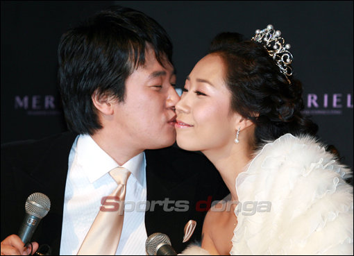 서른다섯 동갑내기 연예인 커플 정선희와 안재환이 17일 오전 서울 남산 하얏트호텔 그랜드볼룸에서 진행된 결혼식 직전 기자회견에서 키스를 하며 다정한 모습을 보이고 있다.