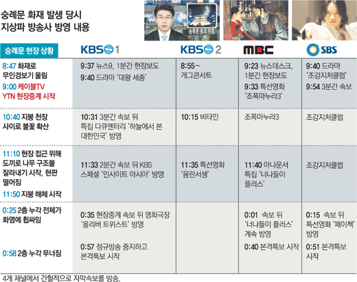 MBC는 오후 9시 23분 ‘뉴스데스크’에서 지상파 3사 중 가장 빨리 화재 현장을 연결해 현장 화면과 리포트를 1분여간 내보냈다. KBS는 10여 분이나 늦은 9시 37분에 ‘뉴스 9’를 통해 현장 화면과 보도를 내보냈다. SBS는 9시 54분에 3분간 속보를 방영했다. 지상파 3사는 이후 밤 12시 넘어 숭례문 붕괴 직전까지도 드라마와 영화, 쇼 등 정규 방송을 중단하는 ‘본격 특보’ 체제를 편성하지 않았다.