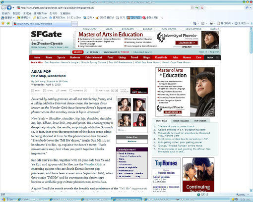 미국 서부에서 정론지로 손꼽히는 샌프란시스코 크로니클(이하 ‘SF크로니클’)는 4월 9일(미국 시간) 온라인 판(www.sfgate.com)에 ‘아시안 팝 : 다음 정류장은 원더랜드’(Asian Pop : Next Stop, Wonderland)라는 제목으로 원더걸스의 미국 진출 과정과 전망에 대해 크게 보도했다.