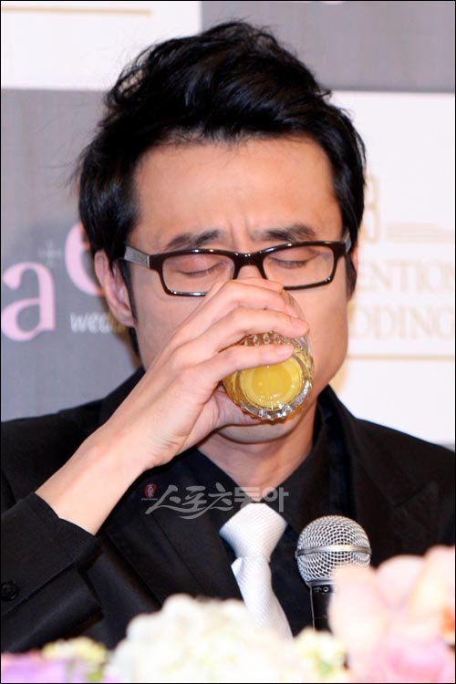 개그맨 이윤석(36)이 4일 오후 서울 여의도 63빌딩 엘리제홀에서 미모의 한의사와의 결혼발표 기자회견을 열고 노총각 탈출을 선언했다. 기자회견 도중 음료수를 들이키는 이윤석의 표정이 마치 한약을 먹는 듯하다. 양회성 기자 yohan@donga.com