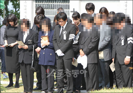 최씨의 유해를 안치에 앞서 가진 추도예배에서 유가족과 동료 연기자들이 묵념을 하고 있다.