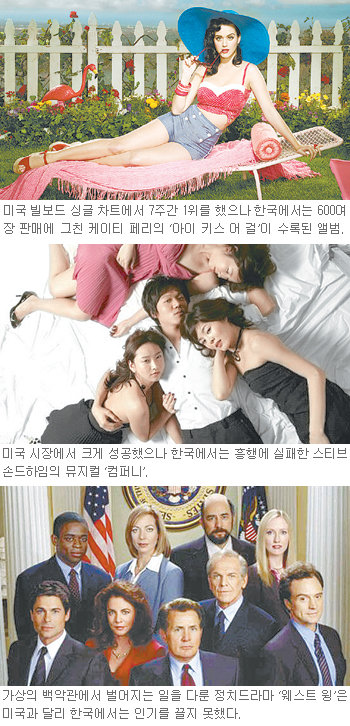 조나스 브러더스, 릴 웨인, 리오나 루이스, 도트리 등 빌보드에서는 1위를 휩쓸었지만 한국에서는 주춤했던 대표적인 예다. 반면 제니퍼 로페즈의 ‘브레이브’ 니요 ‘매드’ 등은 한국 직배사도 예측하지 못했던 의외의 히트곡. 빌보드 차트 1위라는 이력은 이제 한국에서의 흥행보증수표가 될 수 없게 된 셈이다.
