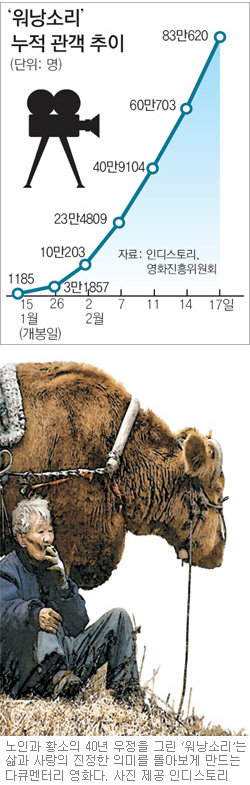 ‘워낭소리’는 이달 초 10만 고지를 넘었으나 이후 입소문을 타고 관객들이 몰리면서 20여 일 만에 100만 명을 눈앞에 두고 있다. 토요일인 14일에는 하루 동안 11만2037명이 보기도 했다.
