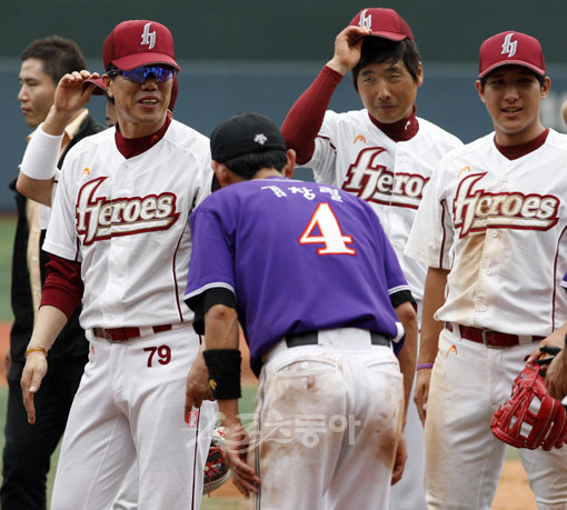 경기를 마친 후 천하무적 김창렬이 머리를 숙여 김시진 감독에게 인사하고 있다.
