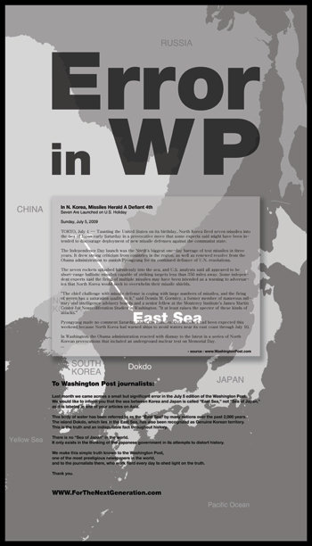 이들은 광고에서 7월 워싱턴 포스트에 실린 한반도 관련 기사에 ‘Sea of Japan’(일본해)으로 표기 된 것이 ‘East Sea’(동해)가 옳다고 지적하는 그림을 선명하게 넣었다.