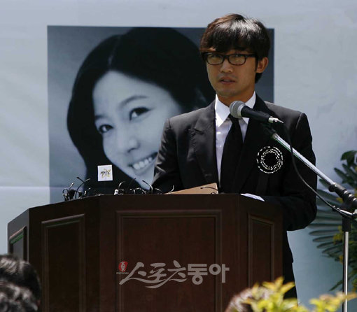 배우 안재욱이 4일 오후 경기도 광주시 분당 스카이캐슬 추모공원에서 열린 故 장진영 추모식에서 추도사를 낭독하고 있다. 광주(경기) | 임진환 기자 photolim@donga.com