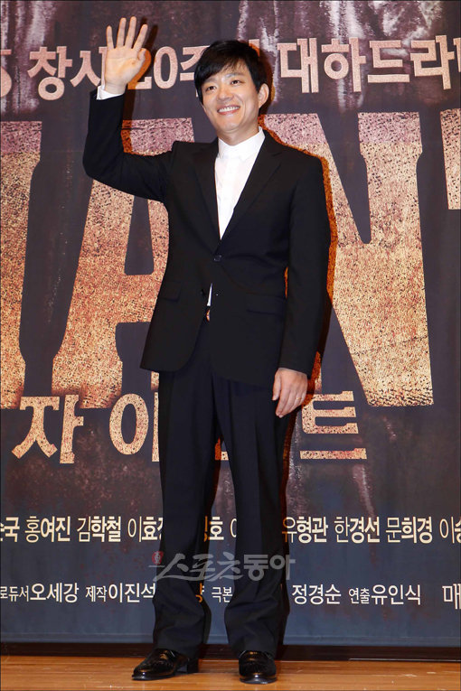 4일 오후 서울 목동 SBS 사옥에서 열린 창사 20주년 대하드라마 ‘자이언트’(극본 장영철·정경순, 연출 유인식) 제작발표회에서 탤런트 이범수가 플래시 세례를 받으며 포즈를 취하고 있다.